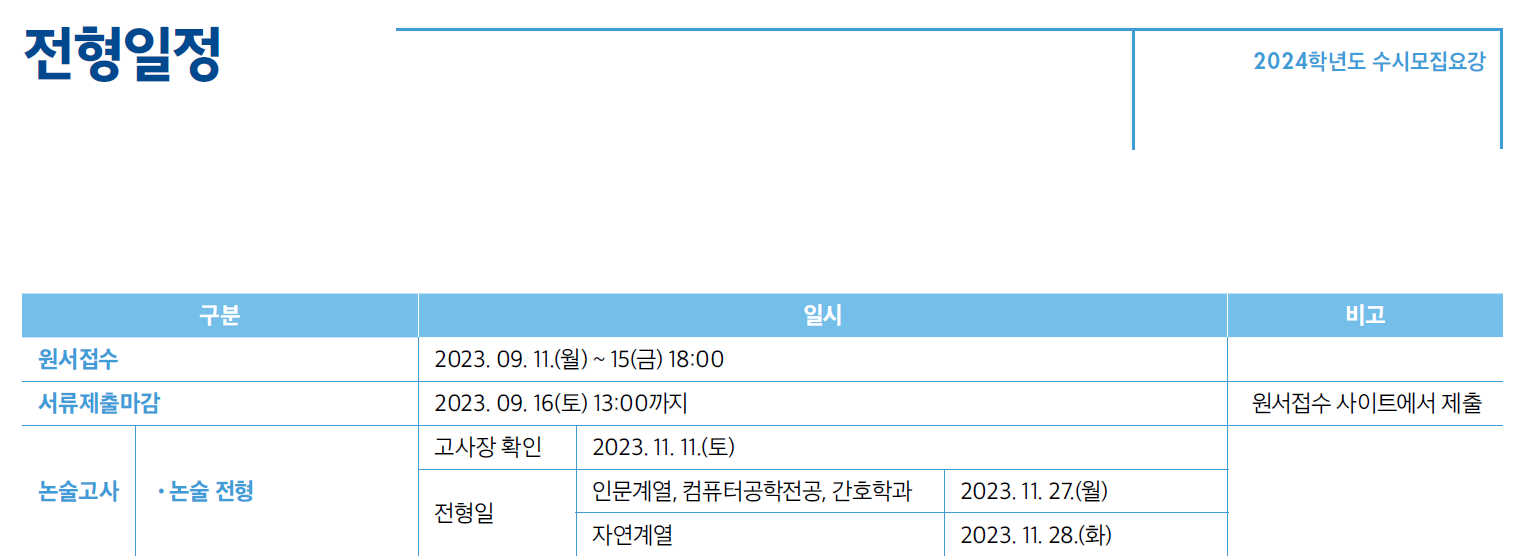 가천대 논술 전형의 경우 고사장 확인은 2023.11.11(토)에 확인 가능합니다. 수시모집요강 상의 비고란(원서접수 사이트에서 제출)이 한 칸 위로 올라와야 되는데 입학처에서 실수를 했나 보네요.