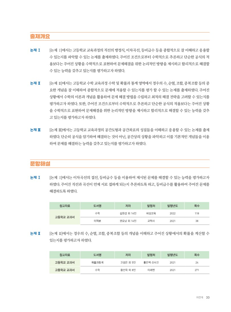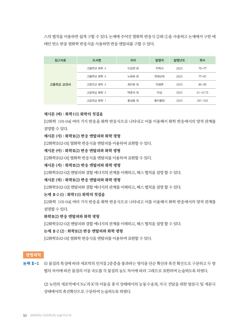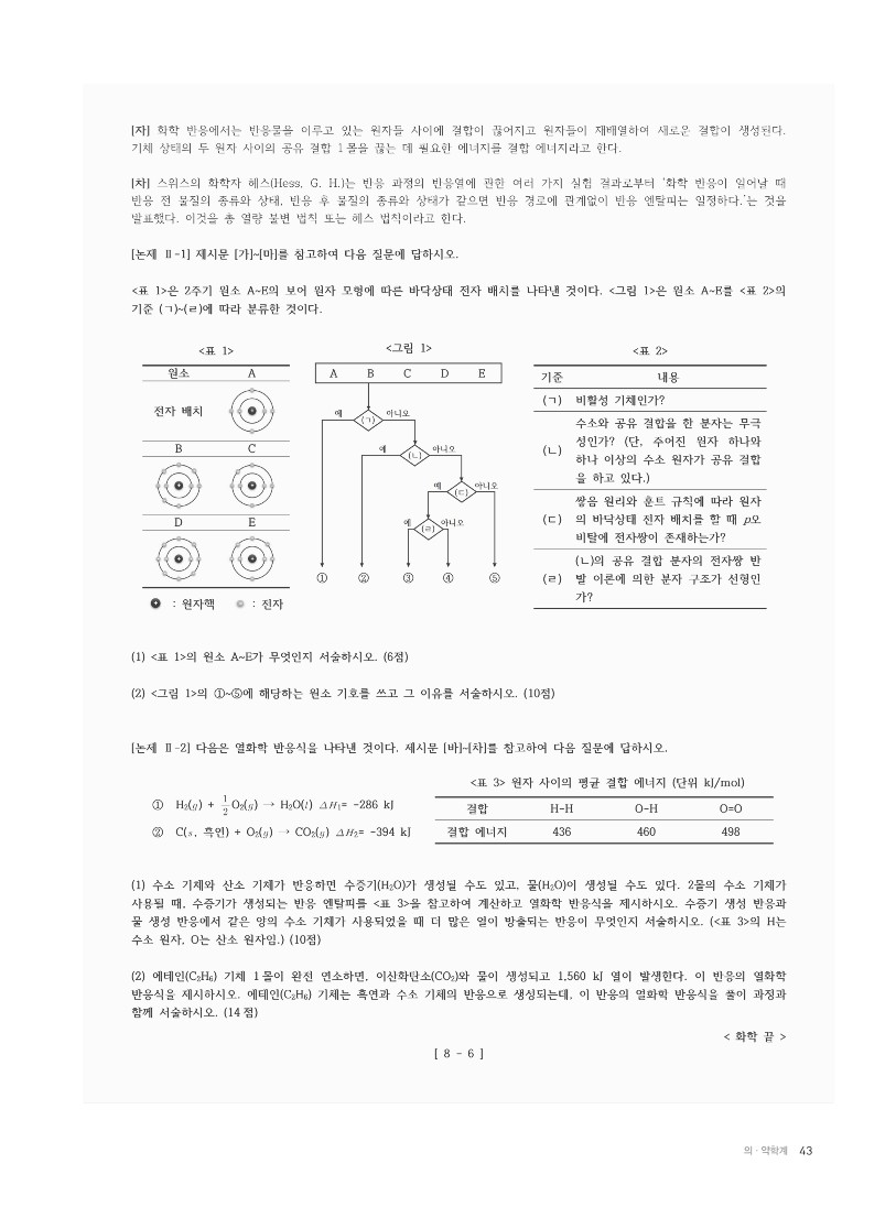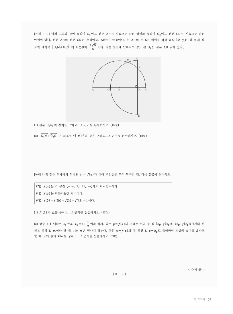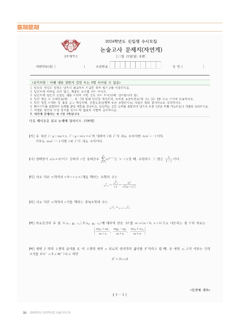 자연계열에서는 수리논술 중심의 문제가 출제되며, 의·약학계열은 수리논술에 더해 과학논술까지 포함됩니다. 자연계열 응시자들은 4~6개의 수학 문항에 답변해야 하며, 의·약학계열 지원자는 수학 문제에 더해 물리학, 화학, 생명과학 중 선택한 과목의 과학 문제를 포함해 각 4문항에 답변하게 됩니다. 자연계열과 의·약학계열 모두 논술 답안은 노트 형식의 지정된 답안란에 작성하게 되어, 명확한 풀이 과정과 논리력이 중요합니다.