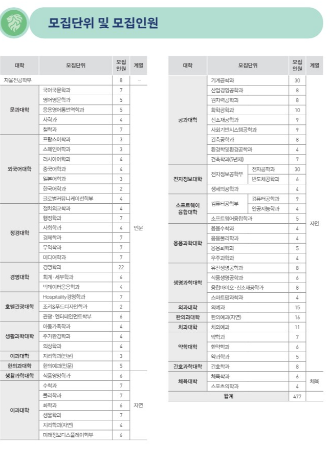 인문/자연 계열 및 자율전공학부(의예과·한의예과·치의예과·약학과 제외): 국어, 수학, 영어, 사회/과학탐구(2과목) 중 2개 영역 등급의 합이 5 이내이며, 한국사 5등급 이내입니다.