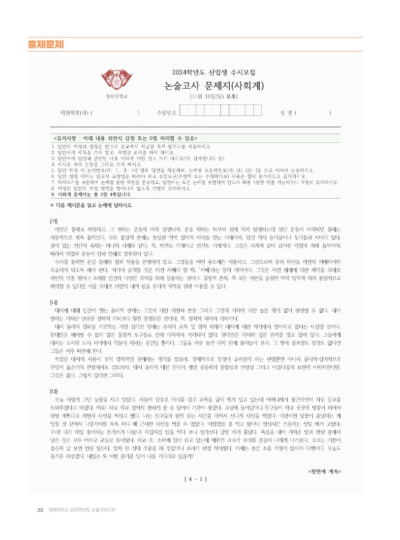 경희대 논술전형은 계열별 특성에 맞춘 다양한 문제 형식을 통해 지원자의 사고력, 논리력, 표현력을 종합적으로 평가하고자 하므로, 각 계열에 맞는 준비가 필수적입니다.