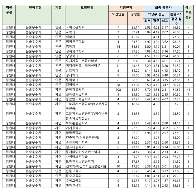 인문계열의 경우 국어국문학과 평균 내신은 4.02, 논술 평균은 76.86점으로 나타났으며, 법학과는 4.10, 행정학과는 3.99 등 대체로 내신 4등급대 중반에서도 합격이 가능합니다. 자연계열에서는 전자전기공학과가 평균 내신 3.58, 논술 평균 90.3점으로 높은 논술 성적을 보였습니다.