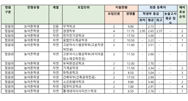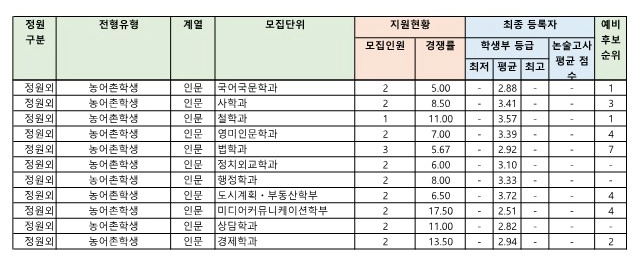 단국대 농어촌전형의 경우 모집인원이 대부분의 학과에서 2명이었으며 평균등급은 2점대 후반에서 3점대 초반으로 형성되었습니다. 희망학과의 자세한 내용은 아래 사진을 참고하시기 바랍니다.