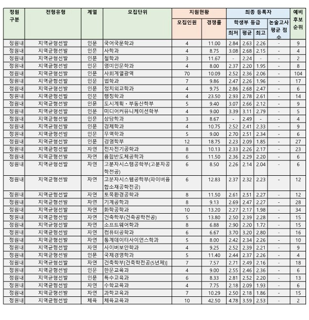 기회균형 선발은 아무래도 인원수가 적기에 평균등급 위주로 보시는 걸 추천드리며 사실상, 매해 변동성이 큰 전형이니 수시 지원에 참고하시기 바랍니다.