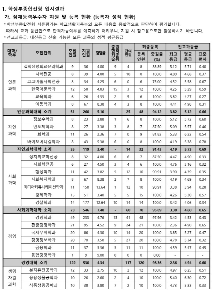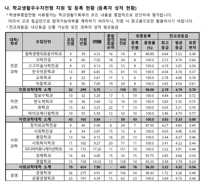 그래서 모 대학의 경우 교과의 경우는 모집인원수가 많은 학과를 쓰는 걸 추천하는 입학사정관 분들도 있으니 지원하려는 학과의 모집인원수를 꼭 확인하시면 도움이 될 것입니다.