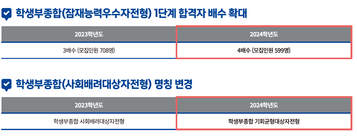 동아대 잠재능력우수자전형의 경우 1단계 합격자 배수를 작년에는 3배수를 선발했는데 올해(2024학년도 입학생 기준)으로는 4배수를 선발하네요. 면접이 있는 전형은 면접 점수로 인해 합불이 바뀌는 경우가 많이 있으니 참고하시기 바랍니다.