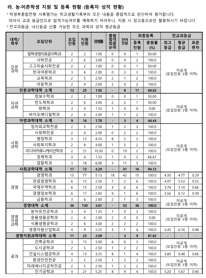 동아대 수시등급 농어촌학생전형 또한 사배자 전형과 마찬가지로 모집이원이 3명 이하인 학과가 많아서 평균등급이 공개가 안된 경우가 많습니다. 농어촌 전형의 경우도 경쟁률을 보고 지원하는 경우들이 많이 있으니 경쟁률 및 수시등급 아래 사진을 통해 확인하시기 바랍니다.