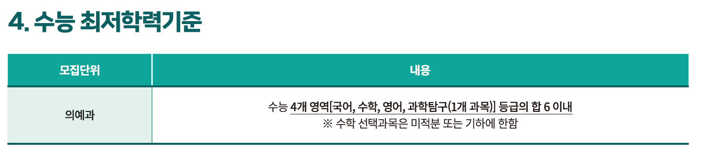 동아대 지역인재 종합전형의 의예과는 4합 6의 최저가 필요합니다. 탐구는 1개 과목이니 아무래도 2개 과목을 반영하는 의예과에 비해서는 최저 기준이 완화된 편입니다.