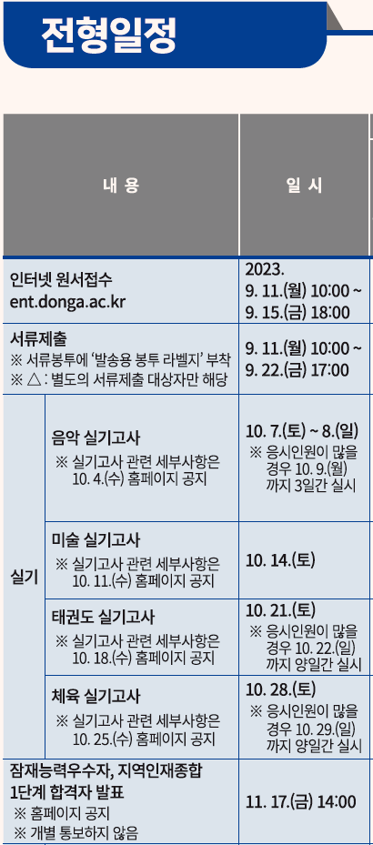 동아대의 실기고사일과 면접일은 아래 사진과 같습니다.