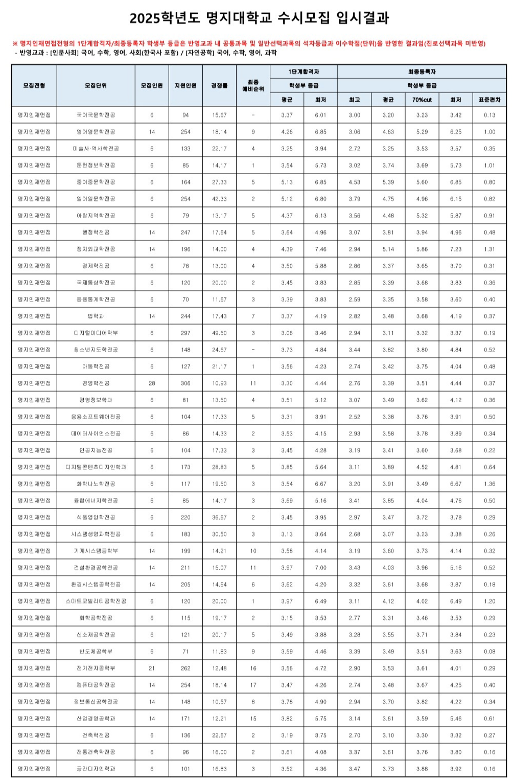 2025학년도 명지대학교 수시모집 결과를 분석해 보면, 각 전형별 특성과 학과별 요구 성적이 뚜렷하게 구분되며, 수험생의 상황에 따라 전략적인 선택이 매우 중요한 대학임을 확인할 수 있습니다. 교과전형은 전반적으로 2등급 초중반에서 안정적인 등급선이 형성되었고, 종합전형은 서류와 면접에 따라 3등급 후반까지도 합격이 가능한 유연한 구조를 보였습니다.