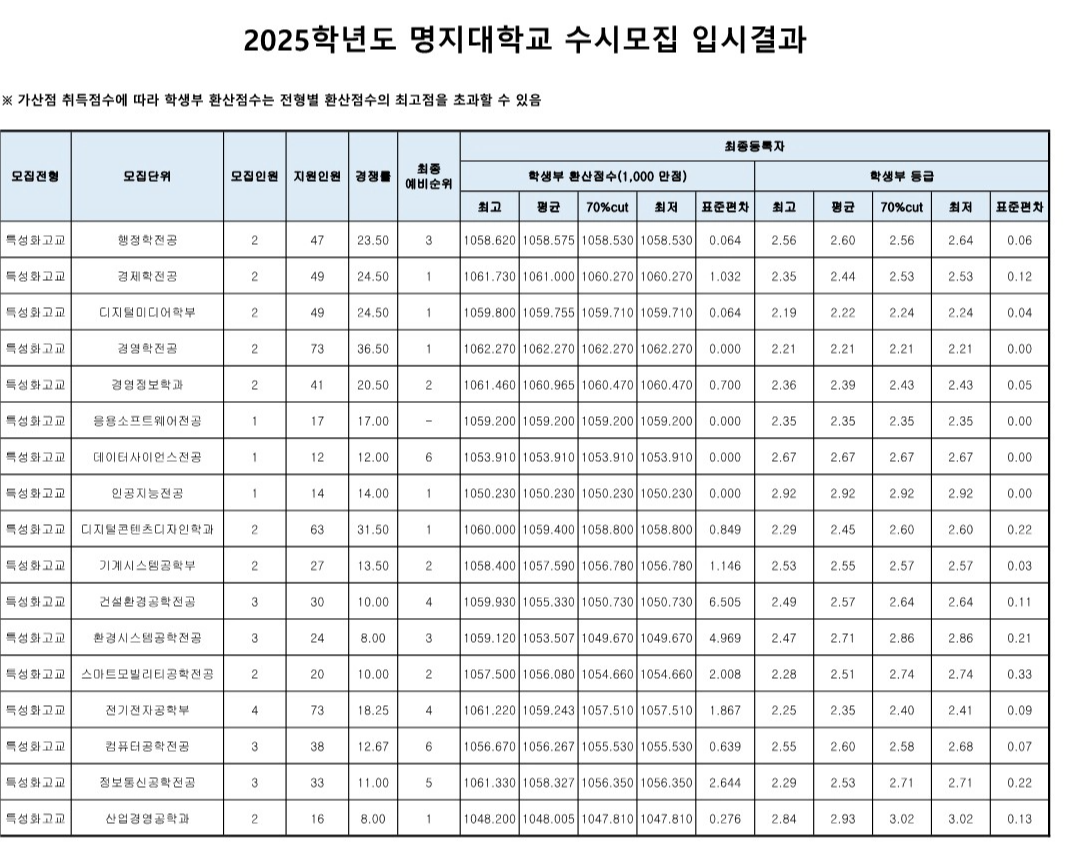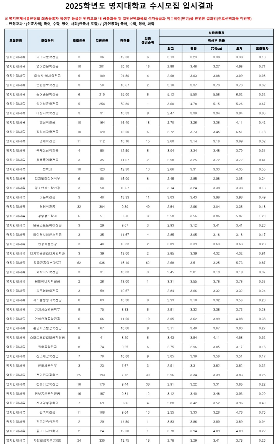 명지대학교의 2025학년도 수시모집에서 학생부종합전형(명지인재면접전형)은 서류와 면접을 함께 평가하는 전형으로, 단순한 내신 성적보다는 학생의 종합적인 역량과 표현 능력이 중요한 평가 기준이 됩니다. 실제 입결을 보면, 전기전자공학부는 평균 3.61, 반도체공학부는 3.51, 컴퓨터공학전공은 3.67로 나타났으며, 산업경영공학과는 평균 3.59에서 최대 5.75까지 분포가 확인되었습니다.