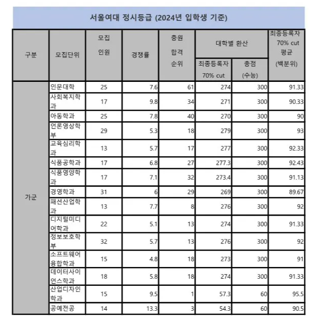 서울여자대학교 가군에 속한 주요 학과별 등급과 평균 성적 및 경쟁률 70% 커트라인은 아래와 같습니다.