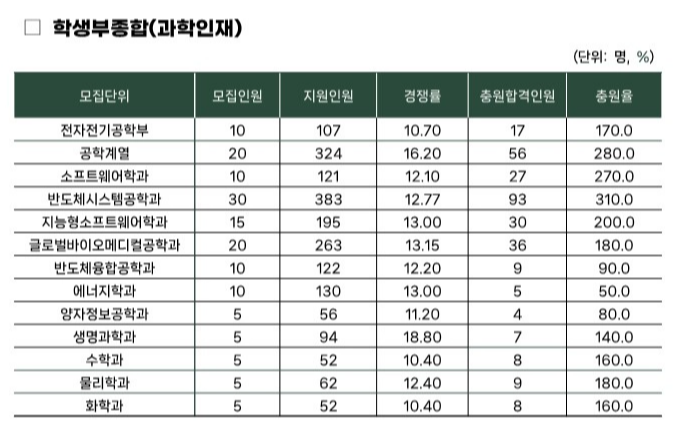 성균관대학교의 학생부종합(과학인재) 전형은 수능최저학력기준 없이 학교생활기록부와 면접만으로 선발되는 전형으로, 과학과 수학 분야에 특화된 지원자를 선발하는 것이 특징입니다. 면접은 수학·과학 교과형 제시문 기반의 블라인드 방식으로 진행되며, 1단계 서류평가 70%, 2단계 면접평가 30%를 반영하여 총점 순으로 최종 합격자를 가립니다. 2025학년도 전형 결과를 보면, 반도체시스템공학과는 30명 모집에 93명이 충원되어 충원율 310.0%를 기록했고, 공학계열(280.0%), 소프트웨어학과(270.0%), 지능형 소프트웨어학과(200.0%) 등 다수 모집단위에서 200%를 넘는 충원율을 보였습니다.