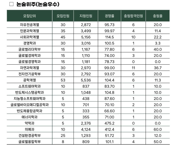 수험생 입장에서는 경쟁률만 보고 주저하기보다는, 충원율이 높은 전형에 전략적으로 지원하는 것이 현명한 판단일 수 있습니다. 반면, 논술우수자전형은 106.4:1이라는 높은 경쟁률에 비해 충원율은 18.7%에 불과해, 당락이 논술 성적에 의해 빠르게 결정되고 예비 기회가 거의 없는 전형임을 알 수 있습니다. 전형 간 특성을 파악하고, 충원율이 높은 전형을 중심으로 실질적인 합격 가능성을 판단하는 전략이 필요합니다.