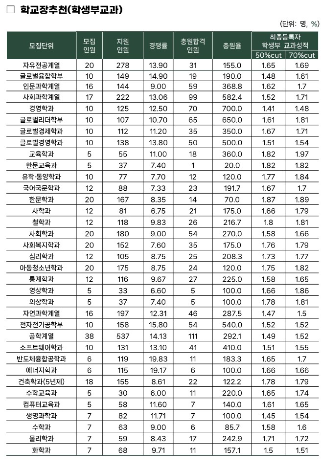 50% 컷 기준 내신은 대부분 1.5등급 전후로 형성되었고, 글로벌융합학부는 1.48, 자연과학계열은 1.47, 생명과학과는 1.45로 확인되어 교과 중심 전형답게 매우 높은 성적대의 학생들이 최종 등록했음을 보여줍니다. 특히 충원율이 높은 사회과학계열(582.4%)과 전자전기공학부(540.0%) 등은 합격선 대비 충원 흐름이 길게 이어지는 경향이 있어, 실제 합격선은 체감보다 낮을 수 있습니다. 따라서 수능 최저 기준을 충족하는 학생이라면 1.6~1.7등급대의 교과 성적으로도 충분히 도전해 볼 만한 전형입니다.