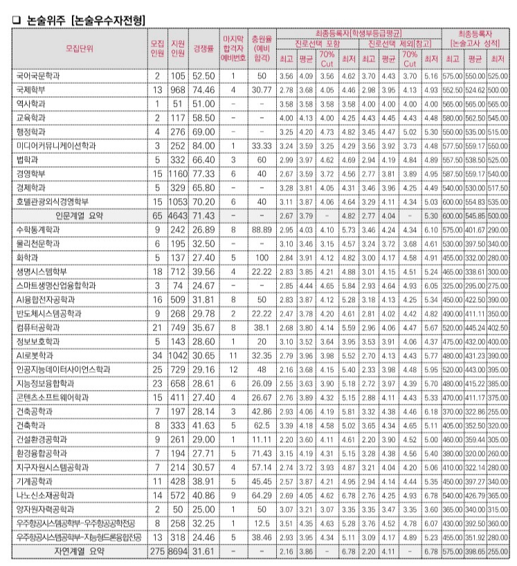 자연계열에서는 나노신소재공학과, 생명시스템학부, 화학과 등에서 평균등급 2.2 전후의 우수한 내신 성적이 요구되었고, 컴퓨터공학과, 콘텐츠소프트웨어학과는 평균 2.5 전후로 형성되어 경쟁이 치열했습니다. 특히 서류형은 자기소개서가 폐지된 이후 생활기록부의 충실한 작성과 학업 역량이 더욱 중요해졌기 때문에, 일반고 학생이라면 평균 등급이 해당 학과 평균에 근접해야 안정적인 지원이 가능합니다.