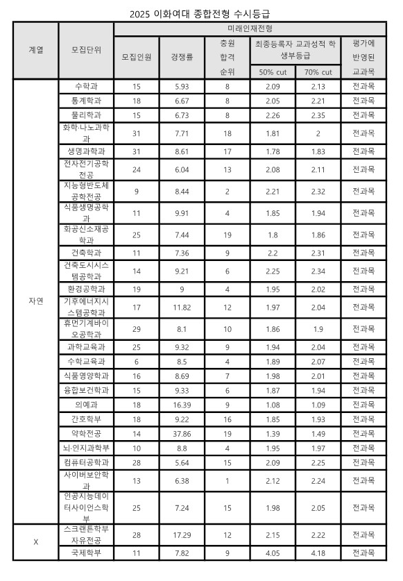 2025 이화여대 수시 주요 학과별 등급 (50% cut 기준)