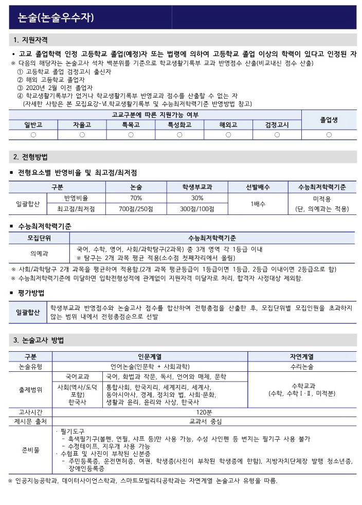 논술고사는 인문계열과 자연계열로 나뉘며, 각 계열에 따라 논술 유형이 다릅니다. 인문계열은 언어논술로, 인문학과 사회과학 분야에서 문제가 출제되며, 주요 교과목으로는 국어, 화법과 작문, 독서, 언어와 매체, 문학, 그리고 한국사 및 사회(역사/도덕 포함) 과목이 포함됩니다. 자연계열은 수리논술로, 수학 교과목인 수학Ⅰ·Ⅱ, 미적분 등을 바탕으로 문제가 출제됩니다. 고사 시간은 120분으로, 모든 문제는 교과서 중심으로 출제됩니다. 준비물로는 흑색 필기구와 수정테이프, 지우개 등이 필요하며, 사진이 부착된 신분증(학생증, 주민등록증 등)을 반드시 지참해야 합니다.