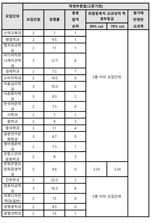 공과대학의 기계공학과와 전기공학과 역시 각각 50% 커트라인이 2.4등급, 2.35등급으로 우수한 성적이 필요하며, 항공우주공학과는 50% 커트라인이 2.53등급으로 안정적 성적 기반이 요구됩니다. 인문사회 계열에서는 행정학과와 미디어커뮤니케이션학과가 각각 50% 커트라인 2.45등급, 2.4등급을 기록하며 높은 학업 성취도를 나타내고 있습니다.