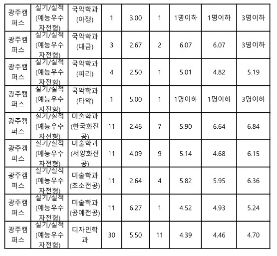 전남대 수시등급 실기 실적 전형의 합격자 50% 커트라인과 70% 커트라인은 아래 사진을 참고하시기 바랍니다.