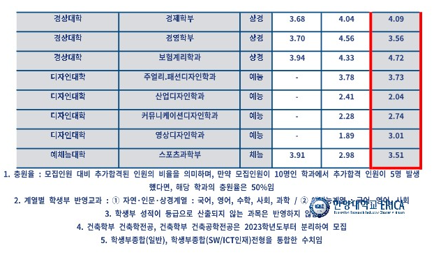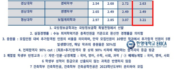 다만, 한양대 에리카의 경우 아래에 더 자세히 설명하겠지만 최저학력기준이 2023년엔 2합 6에서 올해부터 2합 7로 완화되었기에 올해는 합격 커트라인이 적게는 0.2에서 많게는 0.5등급 정도까지도 더 올라갈거라고 개인적으로 예상하고 있습니다.
