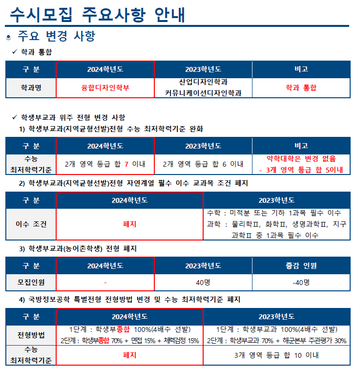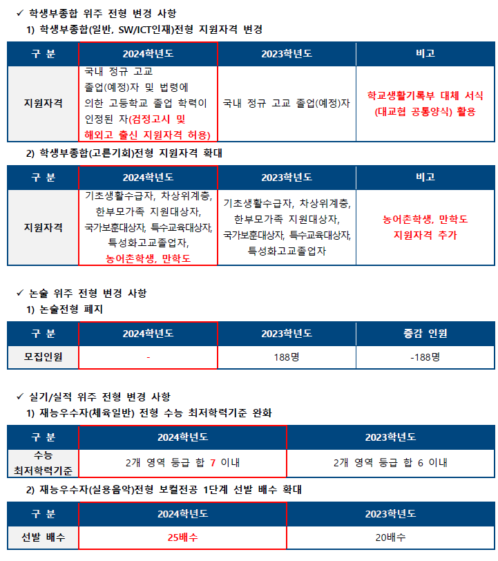 2024 한양대 에리카의 주요 변경사항 중 가장 영향력이 큰 요소는 학생부교과 지역균형선발의 경우 수능 최저학력기준이 완화되었다는 점입니다. 2023학년도 입학생까지는 2합 6이내였지만 2024학년도 신입생부터는 2합 7등급으로 수능 최저가 완화되었습니다.