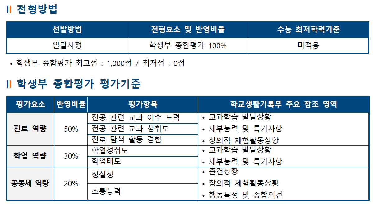한양대 에리카 종합의 경우는 종합평가가 100%입니다. 평가요소에는 진로역량이 50%, 학업역량 30%, 공동체 역량이 20%입니다.