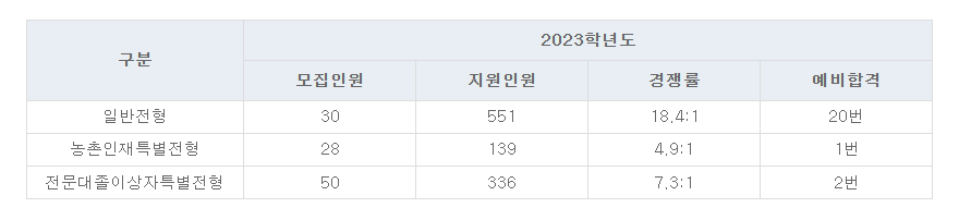 농협대 일반전형의 경쟁률은 약 18:1을 기록했으며 농천인재특별전형의 경쟁률은 약 4:1, 전문대졸이상자특별전형의 경쟁률은 약 7:1을 기록했습니다. 모집인원 및 지원인원에 대한 자세한 내용은 아래 사진을 참고하시면 확인하실 수 있습니다.