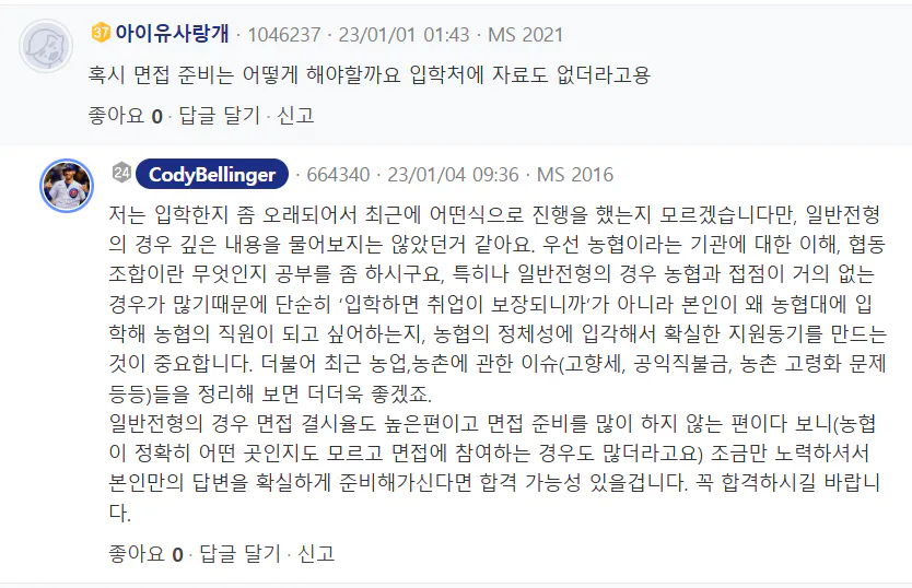 농협대 정시등급 커트라인 질문과 재학생 답변